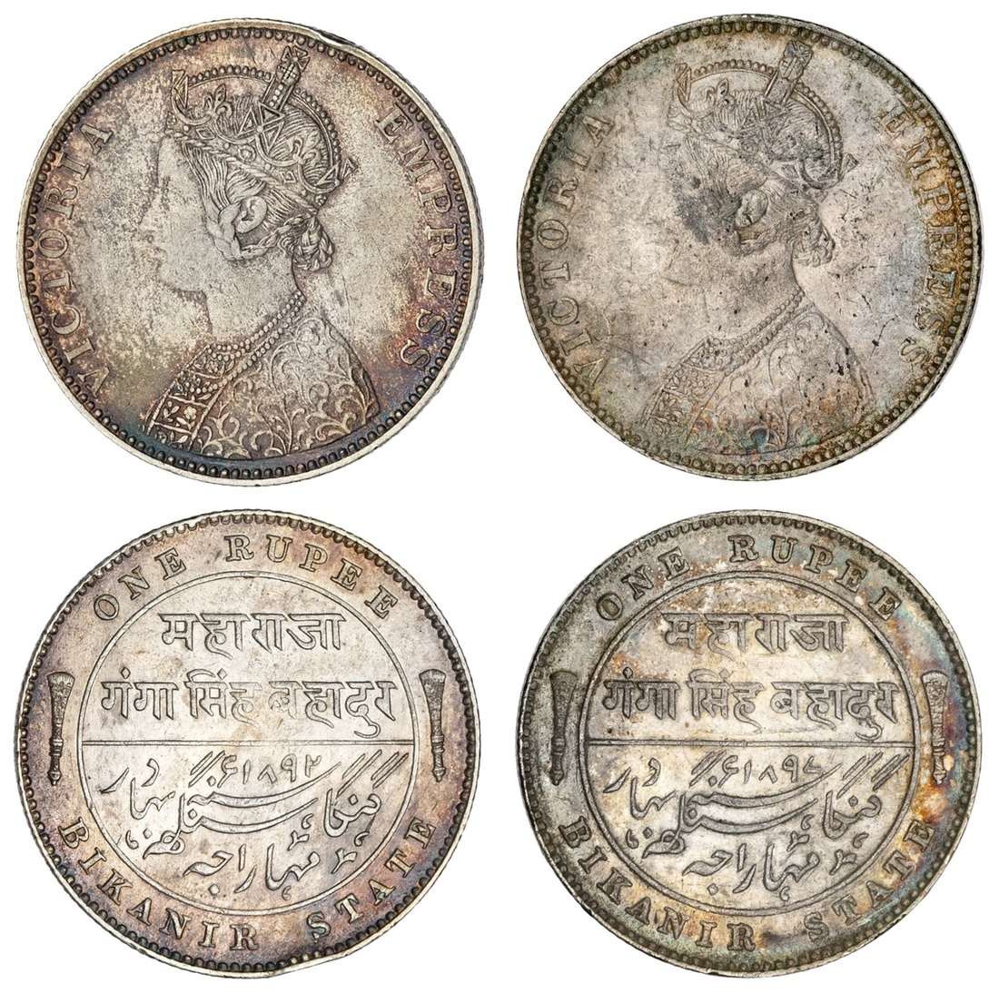 India. Princely States. Bikanir. Ganja Singh (1887-1942). Pair of Victoria-type Rupees, 1892 and 1897. KM 72. The first, small edge bruise, toned. The latter, toned over some bagmarks and very light porosity. About Extremely Fine. Ex Sidney W. Harl and Kenneth W. Harl Collection. (2)