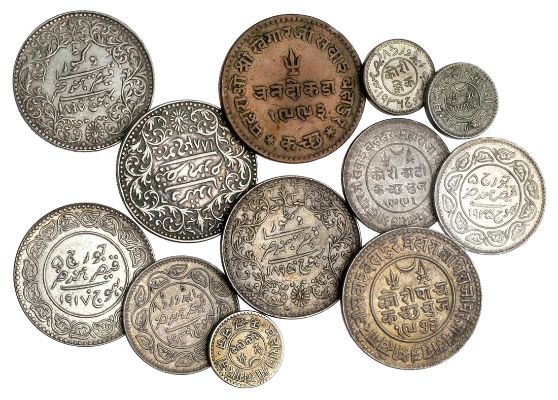 India. Princely States. Kutch. Khengarji III (1875-1942). Small group of earlier 5 Kori: 1884/VS 1940, 1895/VS 1991, 1897/VS 1954, 1916/VS 1973, 1917/VS 1974. Y.37.4, 37.5, 53. VF-Choice EF; and Silver Minors: 2 ½ Kori 1934/VS 1991, 1935/VS 1992, 1936/VS 1992. Y.52a, 66; Kori, 1936/VS 1992 (3). Y65; and ½ Kori, 1928/VS 1985. Y.58. One EF, the others Choice Au-Choice Unc; also AE 3 Dokdo. Ex Sidney W. Harl and Kenneth W. Harl Collection. (14)