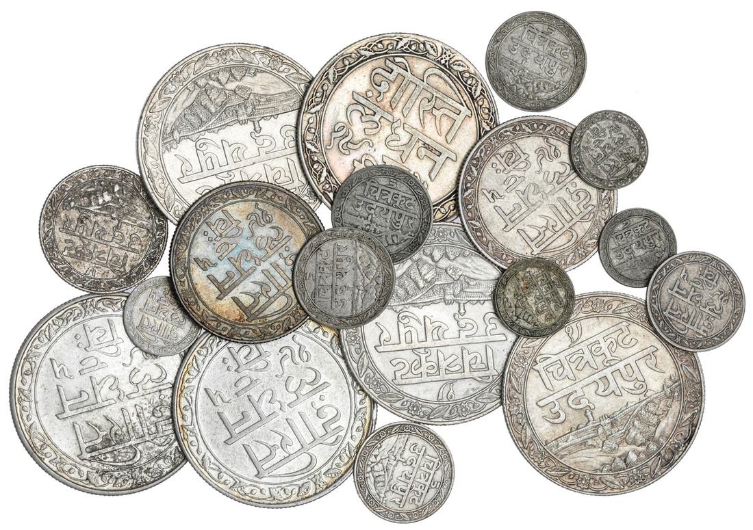 India. Princely States. Mewar. Fatteh Singh (1884-1929). Dosti Lundhun ("Friendship with London") type Silver lot. Rupees (6), ½ Rupee (2), ¼ Rupee, 1/8 Rupee (5), and 1/16 Rupee (5), VS 1985 (1928). Chitarkot-Udaipur. VF-AU. Ex Sidney W. Harl and Kenneth W. Harl Collection. (19).