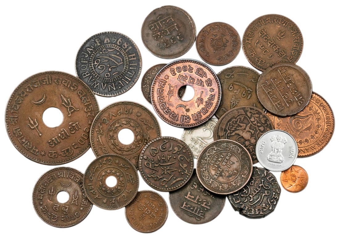 India. Lot of Princely States AEs. Includes: Dhar 1/12 Anna and ½ Pice, 1887. Porous About VF, and Fine with minor deposits; and various from Bahawalpur (2), Baroda (6), Gwalior (7), Hyderabad (16), Indore (3), Jaipur (2), Jaora, Jodhpur (2), Kashmir, Kutch (13), Mewar (3), Mysore, Ratlam, Travancore (3); also two modern India. Generally machine-struck and 19th-20th Century. VG-EF. Ex Sidney W. Harl and Kenneth W. Harl Collection. (65)