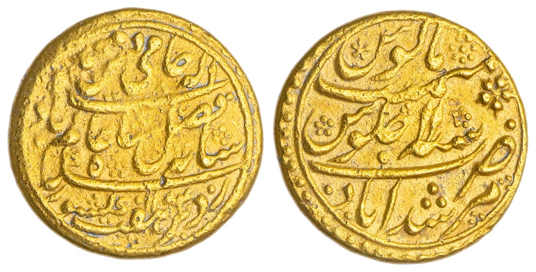 India. East India Company. Bengal Presidency. Mohur, AH 1184, regnal year 11. 12.0 gms. In the name of Shah `Alam II; Murshidabad. Persian couplet, julus formula on reverse. KM 94.2. Sea salved from shipwreck off Mauritius. Very Fine. Ex Kenneth W. Harl Collection.