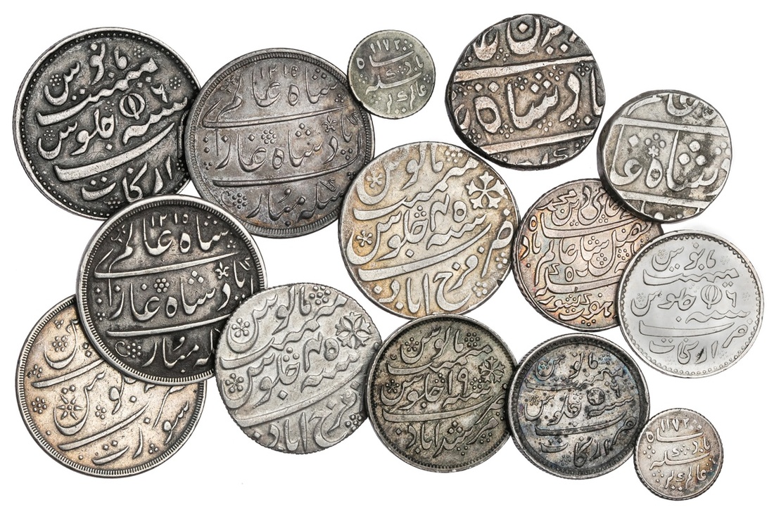 India. East India Company. Lot of Rupees and fractions. Bengal Presidency. Rupee, Calcutta year 19; Farrukhabad year 45. KM 99.1, 69; ½ Rupees, Murshidabad year 19 (2 types). KM 97.1, 116; Bombay Presidency. Dump Rupee, Surat year 46; machine struck Rupees, 1215 year 46 (3). Prid 270, KM 224; and Madras Presidency. Dump Rupee, year 6, machine struck Rupees, AH 1172 year 6. KM 384, 410; ½ Rupees (2), AH 1172 year 6. KM 414, 426; 1/8 Rupees (3) and 1/16 Rupee, AH 1172 year 6. VF-EF. Ex Sidney W. Harl and Kenneth W. Harl Collectionn. (16)