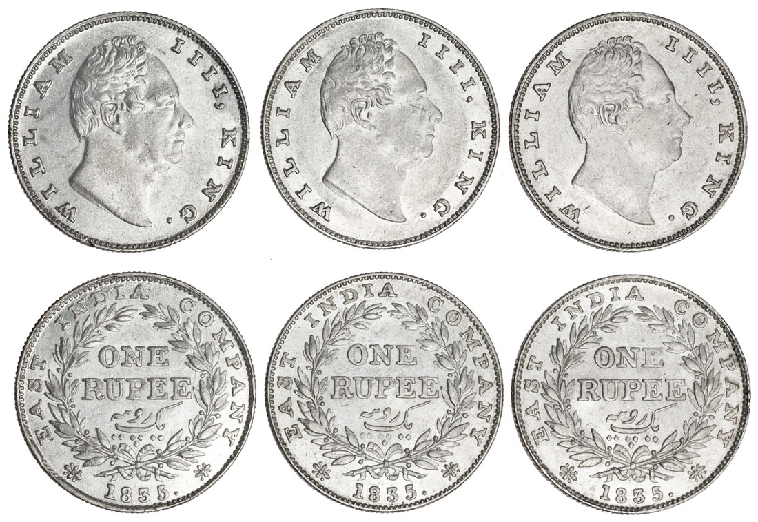 India. East India Company. Regal series. William IV (1830-1837). Rupees, 1835 (3). Bombay. Head right, no initials, rev. Value within wreath. KM 450.1. Good lustre. Extremely Fine-AU. Ex Sidney W. Harl and Kenneth W. Harl Collection. (3)