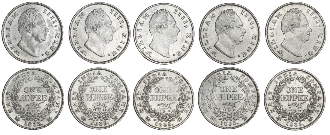 India. East India Company. Regal series. William IV (1830-1837). Rupees, 1835 (5). Calcutta. Head right, raised F on truncation, rev. Value within wreath. KM 450.2. Good VF-Good EF. Ex Sidney W. Harl and Kenneth W. Harl Collection. (5)