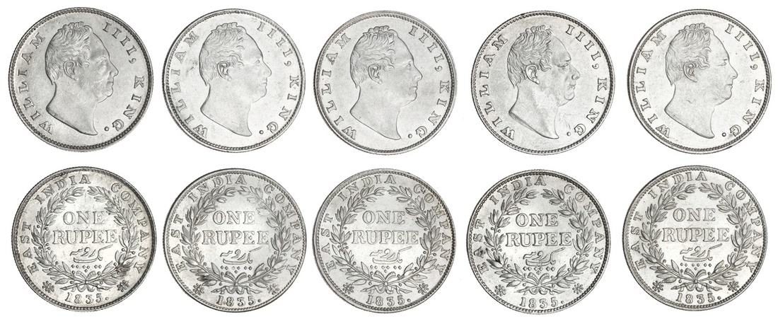 India. East India Company. Regal series. William IV (1830-1837). Rupees, 1835 (5). Calcutta. Head right, F incuse on truncation, rev. Value within wreath. KM 450.3. EF-Choice EF. Ex. Sidney W. Harl and Kenneth W. Harl Collection. (5)