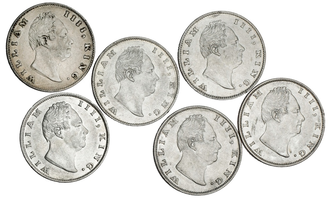 India. East India Company. Regal series. William IV (1830-1837). Rupees, 1835 (6). Calcutta. Head right, F incuse on truncation, rev. Value within wreath. KM 450.3. Good VF-Good EF. Ex Sidney W. Harl and Kenneth W. Harl Collection . (6)