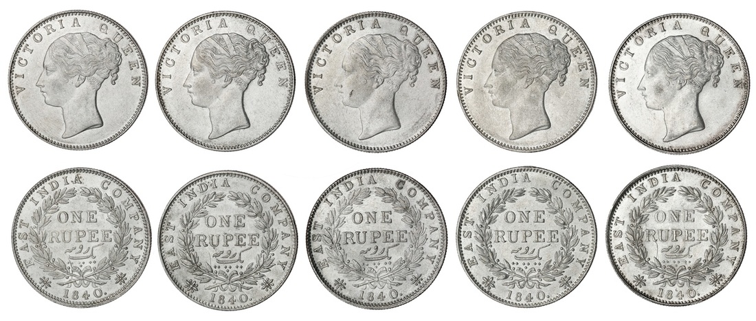 East India Company. Regal Series. Victoria (1837-1901). Quintet of Rupees, 1840. Calcutta. Young head left, continuous legend, rev. Value within wreath. KM 457.1. Extremely Fine-About Uncirculated. Ex Sidney W. Harl and Kenneth W. Harl Collection. (5)