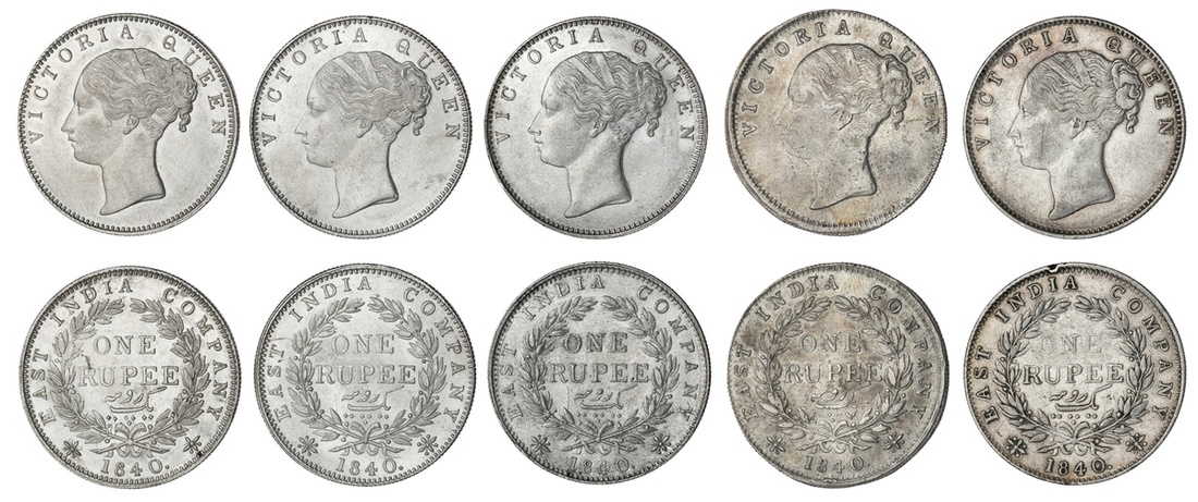 East India Company. Regal Series. Victoria (1837-1901). Quintet of Rupees, 1840. Calcutta. Young head left, continuous legend, rev. Value within wreath. KM 457.1. One a variety, somewhat thinner struck out of collar and with small dot above denticle right of date. VF, Good EF, hairlined EF-AU, AU and VF. Ex Sidney W. Harl and Kenneth W. Harl Collection. (5)