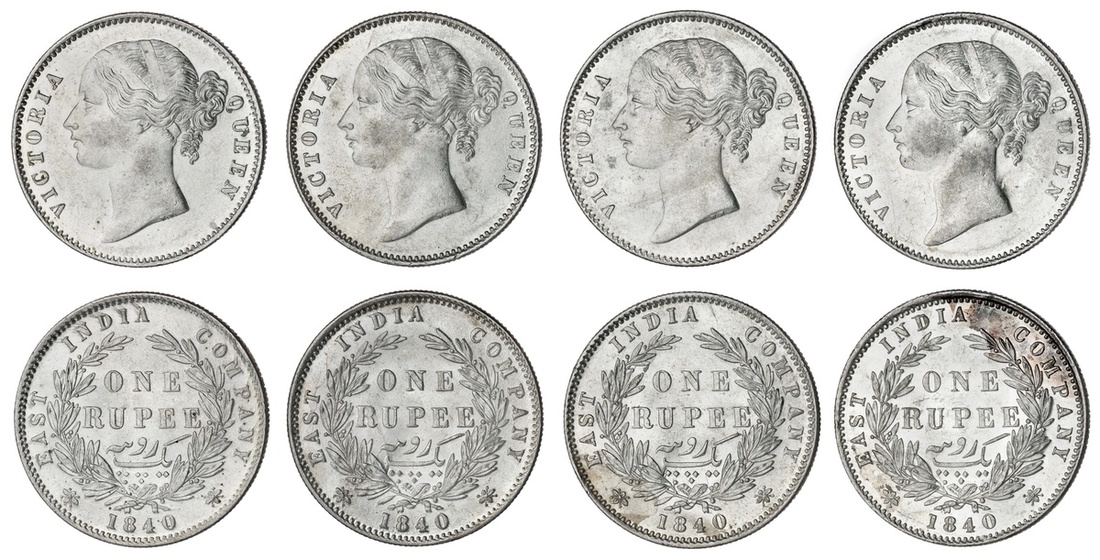East India Company. Regal Series. Victoria (1837-1901). Quartet of Rupees, 1840. Young head left, W.W. raised on truncation, interrupted legend, rev. Value within wreath. KM 458. One with bagmarks. AU-Uncirculated. Ex Sidney W. Harl and Kenneth W. Harl Collection. (4)