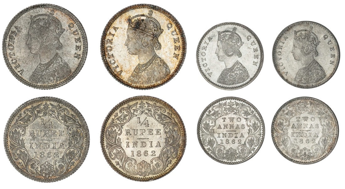 British India. Victoria (1837-1901). Quartet of high-grade 1862 Fractions: 2 Annas (2) and Quarter Rupees (2). Crowned bust left, VICTORIA QUEEN. KM 469, 470. Uncirculated. Ex Sidney W. Harl and Kenneth W. Harl Collection. (4)