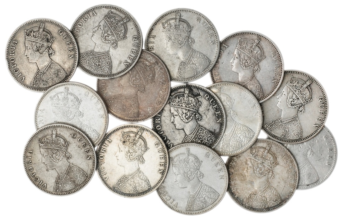 British India. Victoria (1837-1901). Group of KM 473.2 Rupees: 1874 (4), 1875 (4), and 1876 (6). VICTORIA QUEEN. One of the 1875s Uncirculated with bagmarks, the rest Fine-About EF, a few once cleaned or with small surface problem. Ex Sidney W. Harl and Kenneth W. Harl Collection. (14)