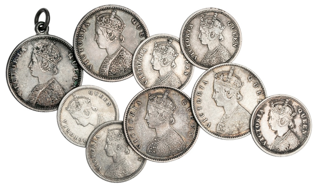British India. Victoria (1837-1901). Lot of 1874-1876 Silver fractions: Half Rupees -- 1874 dot. Bombay, 1875 (2). Calcutta. One cleaned. About VF, and 1876 dot. Bombay. Toned EF, but looped; Quarter Rupees - 1875 (3), 1876 (2). Fine-About EF (once wiped now toning). KM 472, 470. Ex Sidney W. Harl and Kenneth W. Harl Collection. (9)