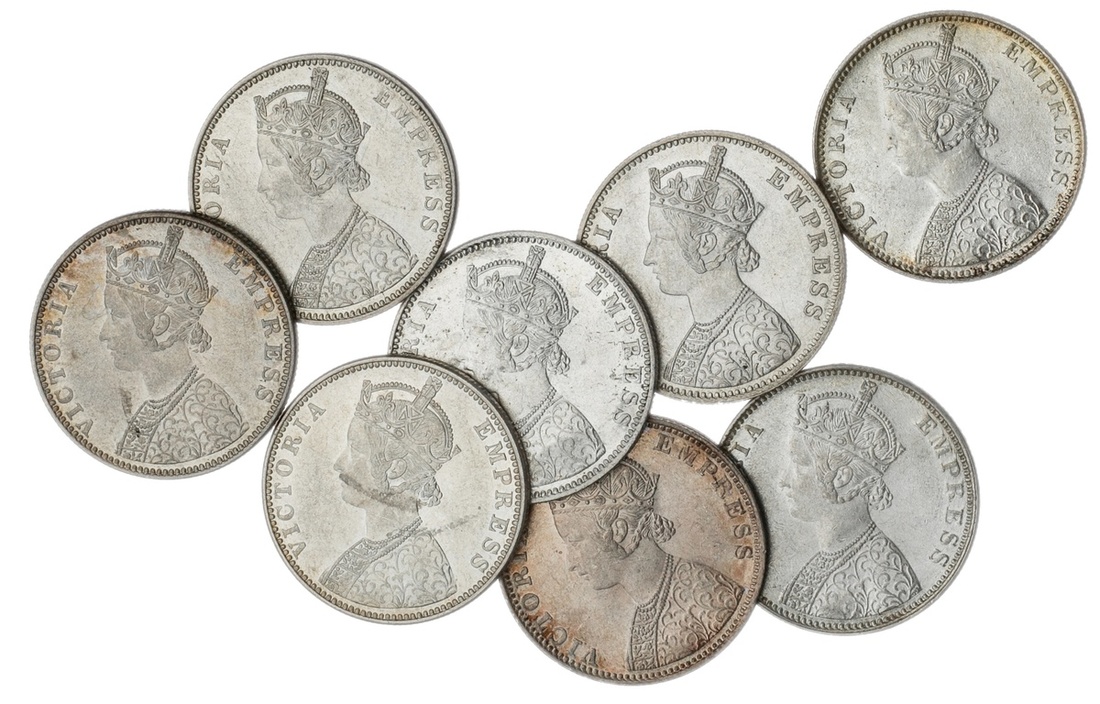 British India. Victoria (1837-1901). Octet of higher-grade Rupees. 1887 incuse B, 1888 raised B, 1889 incuse B, 1890 incuse B (2), 1900 incuse B, 1901 incuse C and 1901 incuse B. KM 492. A few with bagmarks. The 1900 AU, the rest Uncirculated. Ex Sidney W. Harl and Kenneth W. Harl Collection. (8)