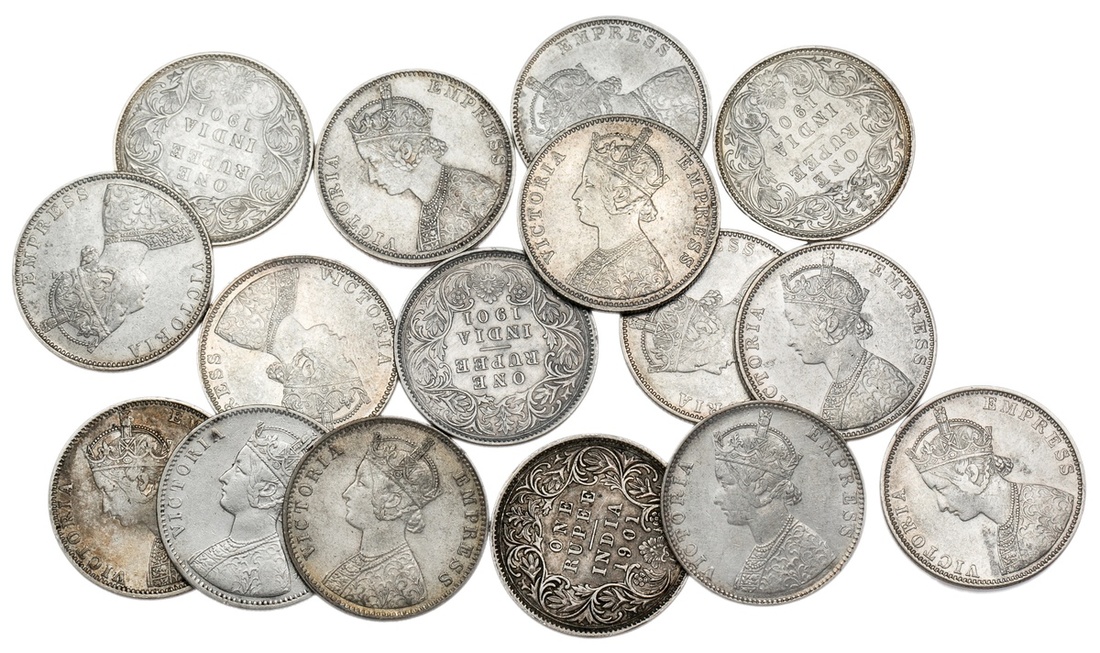 British India. Victoria (1837-1901). Group of late Rupees: 1900 (14), 1901 (32). KM 492. A few once cleaned. About VF-EF. Ex Sidney W. Harl and Kenneth W. Harl Collection. (46)