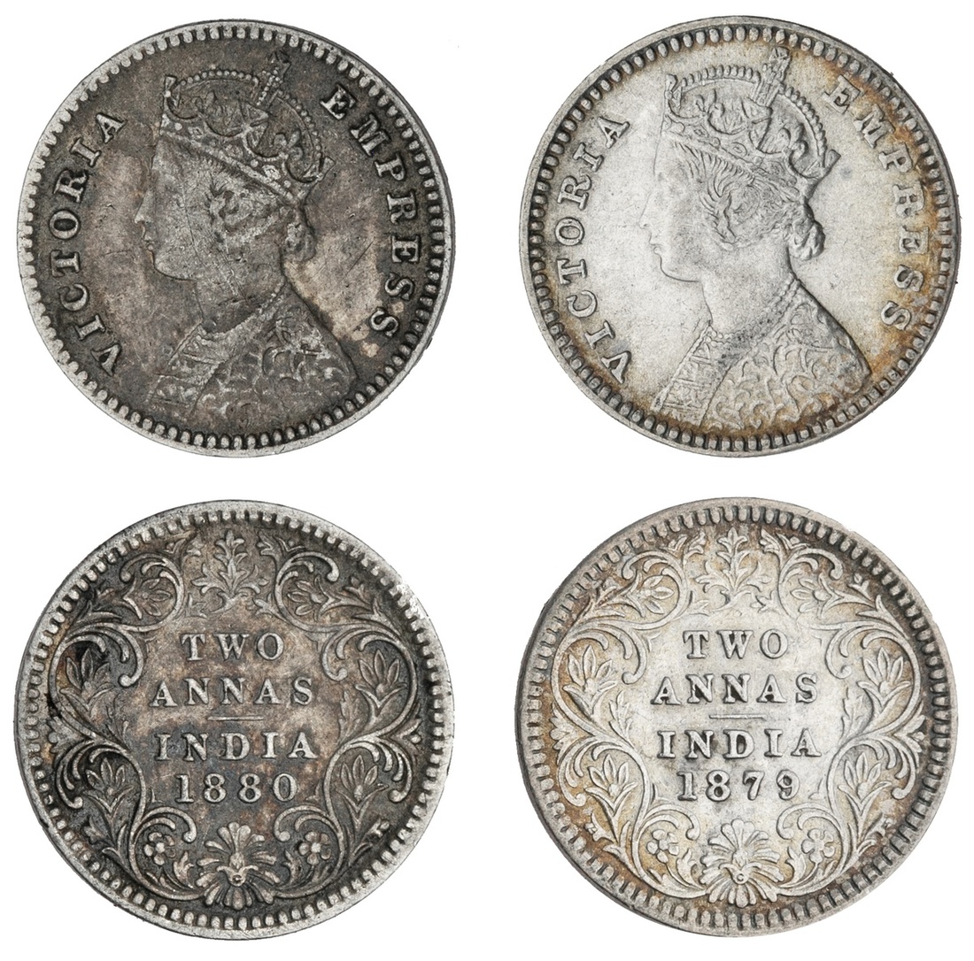 British India. Victoria (1837-1901). 2 Annas, 1879 and 1880 incuse C. Calcutta. Crowned bust left; VICTORIA EMPRESS. KM 488. Very scarce. Both with obverse hairlines, Very Fine and Fine. Ex Sidney W. Harl and Kenneth W. Harl Collection. (2)