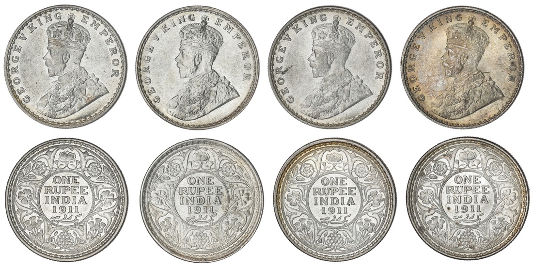British India. George V (1910-1936). Quartet of Rupees, 1911. Bombay (3) and Calcutta. Type I obverse. Crowned bust left. KM 523. Uncirculated. Ex Sidney W. Harl and Kenneth W. Harl Collection. (4)