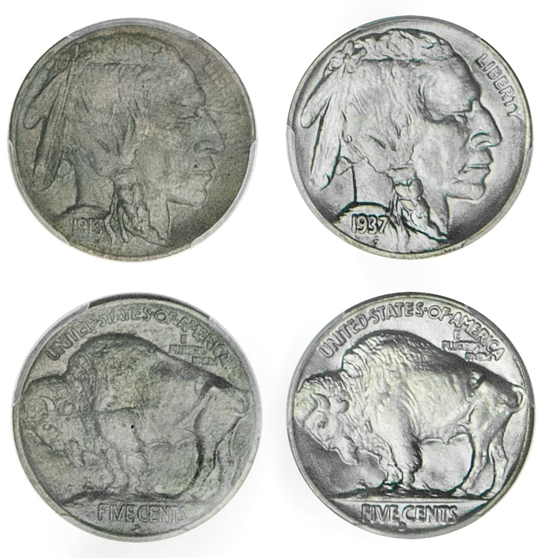 Pair of high-grade Buffalo Nickels: 1913-D. Type I. PCGS MS 64 and 1937-D. PCGS MS 66. (2)