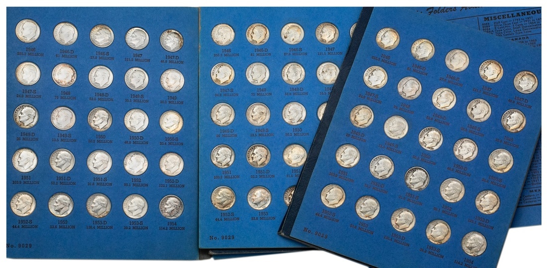 Three Roosevelt Dime Albums. 1946-1965. Housed in Whitman Albums. Two out of the three albums are complete. Fine-Extremely Fine. Sold as is, no returns. [164]