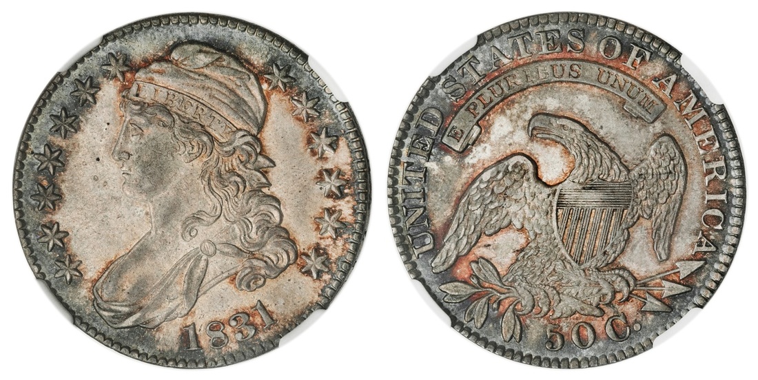 1831 Capped Bust Half Dollar. NGC MS 61. Pale violet with lovely iridescent hues, solid eye appeal.