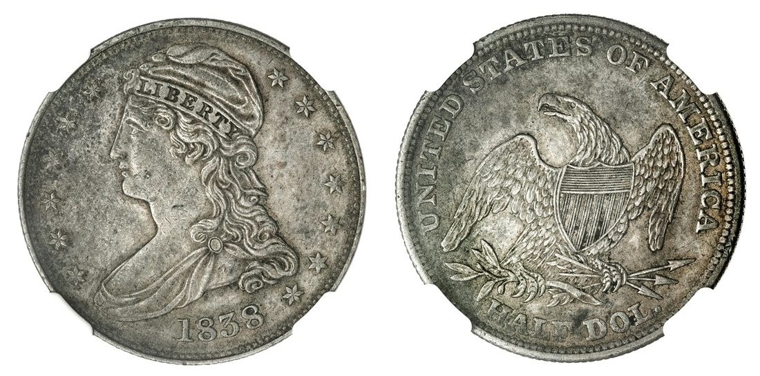 1838 Capped Bust Half Dollar. NGC AU 55. Soft medium gray.