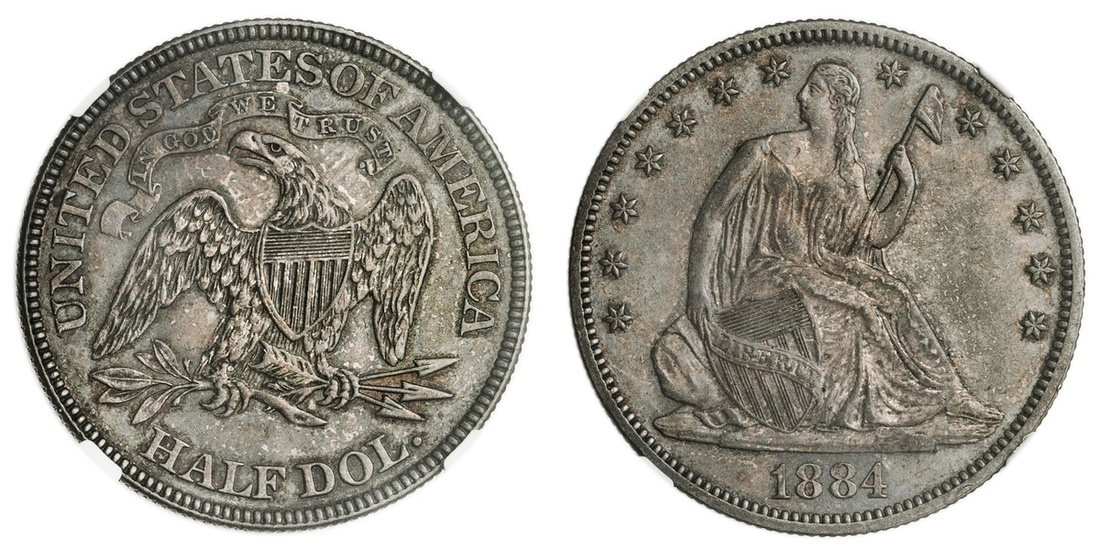 1884 Liberty Seated Half Dollar. NGC AU Details -- stained. Tiny white spot on reverse. An attractive coin with a borderline if not questionable "Details" critique.