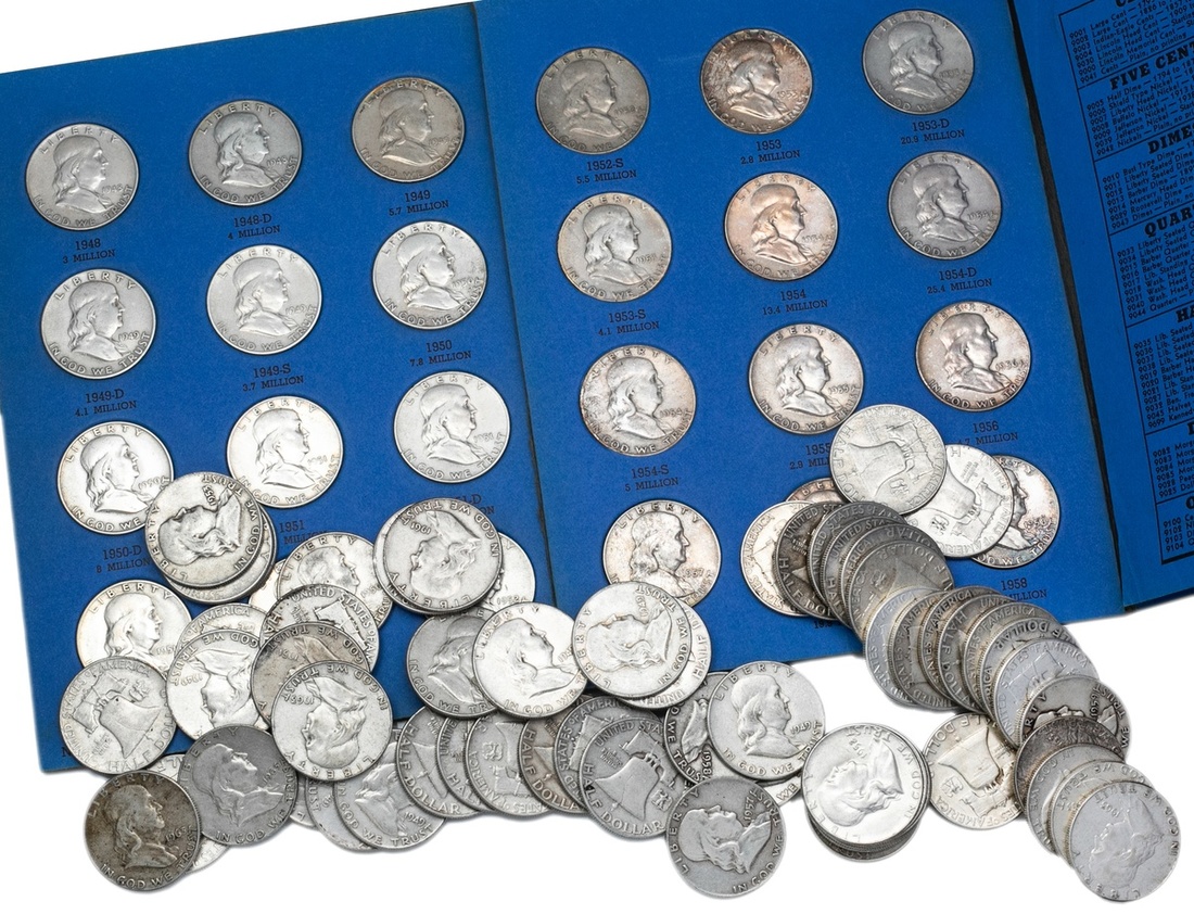 A Grouping of Franklin Half Dollars. 1948-1963, complete in Whitman Album. VF-EF. (35); and two tubes of mixed dates Franklin, 1949-1963 (61), VF-AU details. (96)
