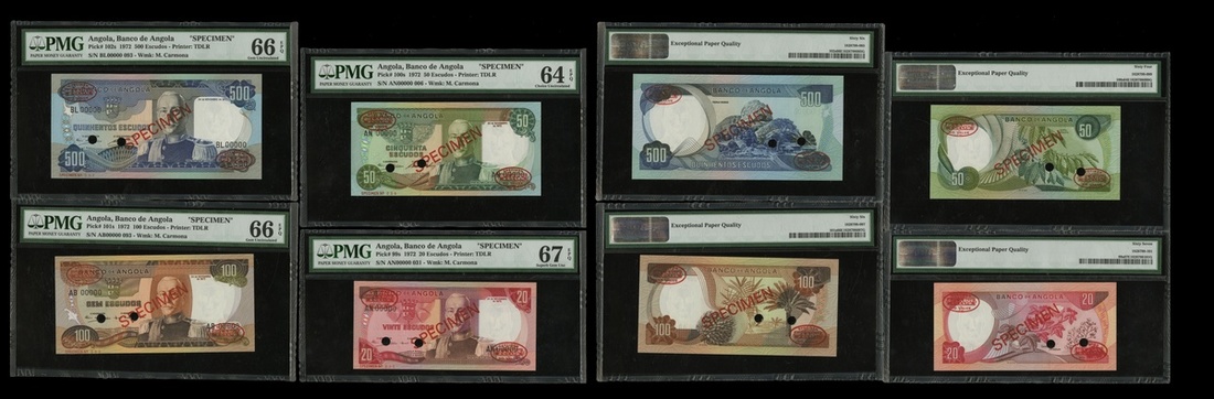 Angola. Banco de Angola. 1972 Specimen Set. 20, 50, 100, 500 and 1000 Escudos. P-99s - 103s. Marechal Carmona portrait at center. Diagonal red SPECIMEN, TDLR stamps top left, bottom right, two punch cancels at left. The first and last PMG 67 Superb Gem Unc EPQ, the 50 Escudos PMG 64 Choice Uncirculated EPQ, the 100 and 500 Escudos PMG 66 Gem Uncirculated EPQ. [5]
