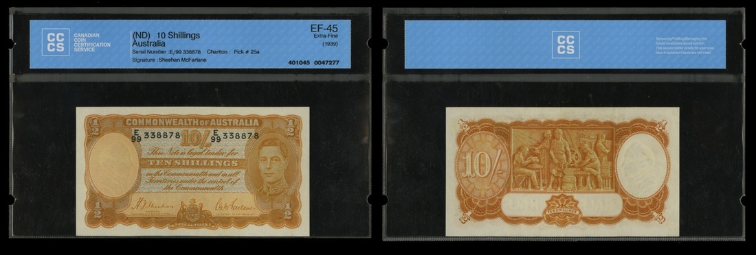 Australia. Commonwealth Bank. 10 Shillings. ND (1939). P-25a. George VI portrait at right, allegorical workshop scene on back. CCCS EF 45.