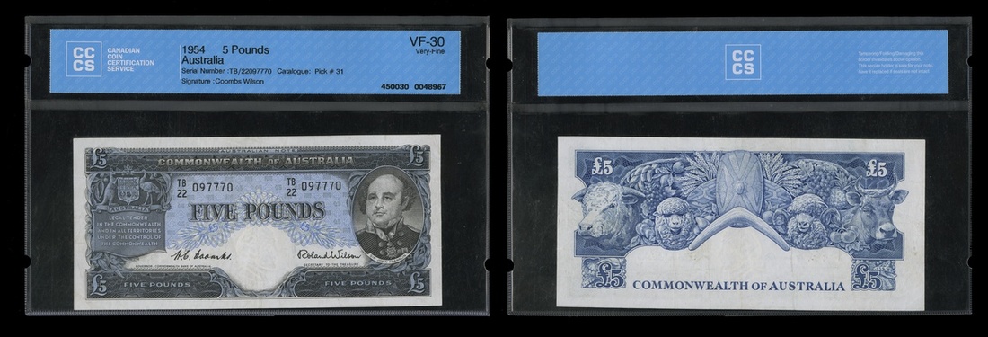 Australia. Reserve Bank. 5 Pounds. ND (1954-1959). Sir John Franklin at right, Arms upper left, livestock and agricultural products on back. CCCS VF 30.