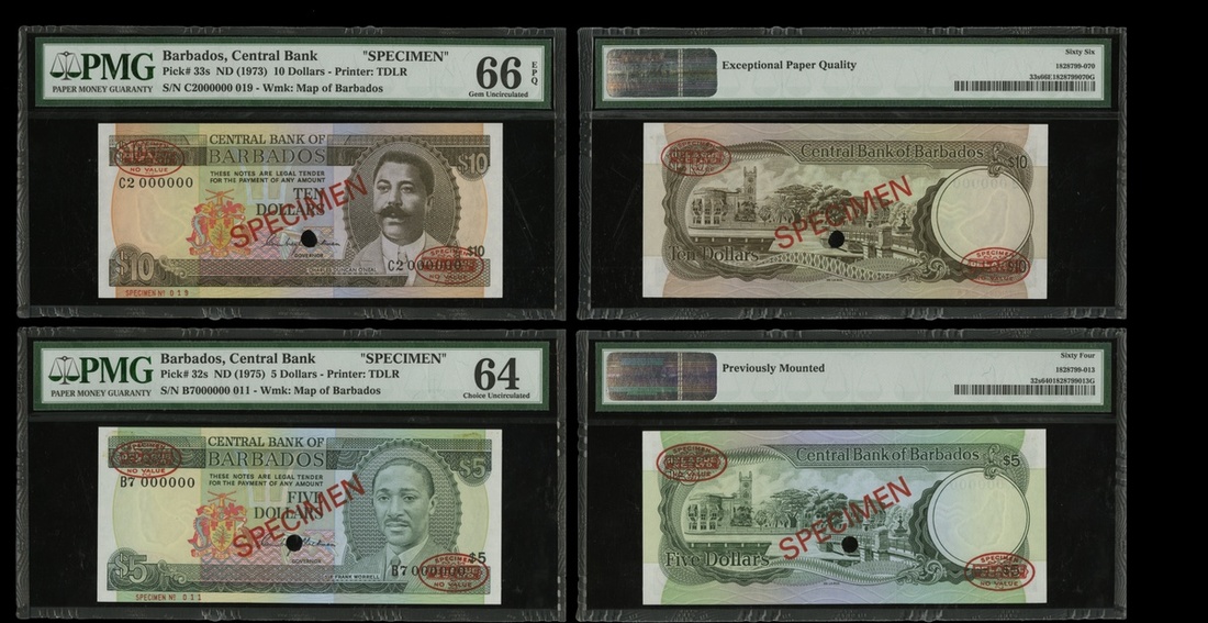 Barbados. Central Bank. 5 and 10 Dollars. ND (1975 and 1973). P-32s, 33s. Specimen. Portrait of Sir F. Worrell at right, of C.D. O'Neal at right. Diagonal red SPECIMEN, TDLR stamps top left, bottom right, single punch cancel bottom center. PMG 64 Choice Uncirculated and PMG 66 Gem Uncirculated EPQ. [2]