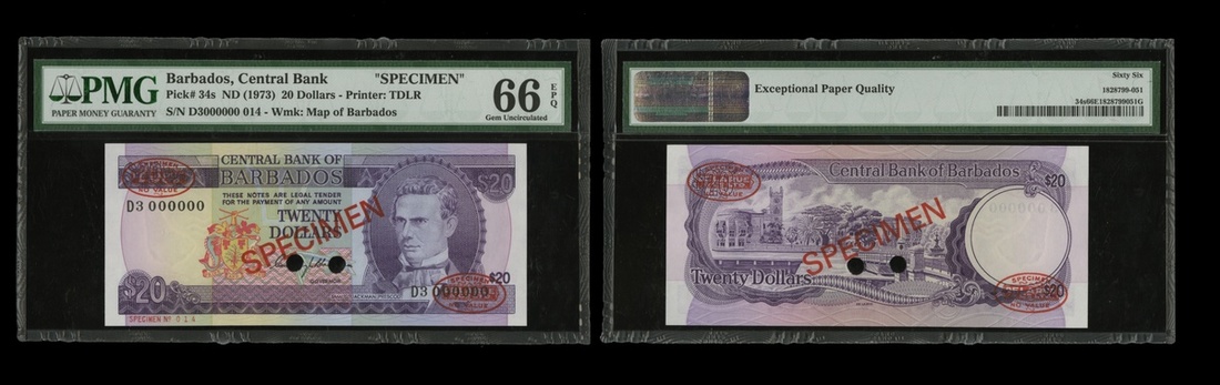 Barbados. Central Bank. 20 Dollars. ND (1973). P-34s. Specimen. No. D3 000000 014. Purple on multicolor. Portrait of S. J. Prescod at right. Diagonal red SPECIMEN, TDLR stamps top left, bottom right, two punch cancels bottom center PMG 66 Gem Uncirculated EPQ.