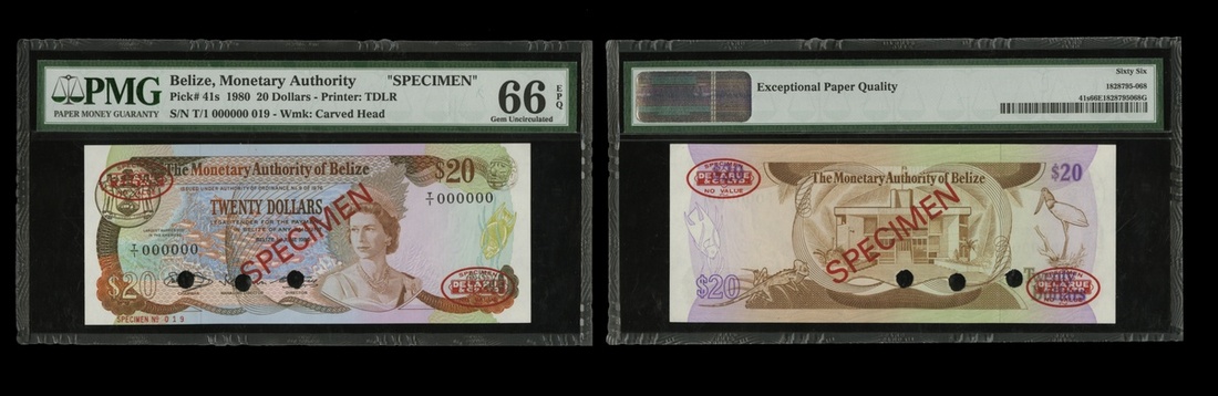 Belize. Monetary Authority. 20 Dollars. 1980. P-41s. Specimen. No. T/1 000000 019. Brown on multicolor. Portrait of Queen Elizabeth II center right. Diagonal red SPECIMEN, TDLR stamps top left, bottom right, three punch cancels bottom left. PMG 66 Gem Uncirculated EPQ.