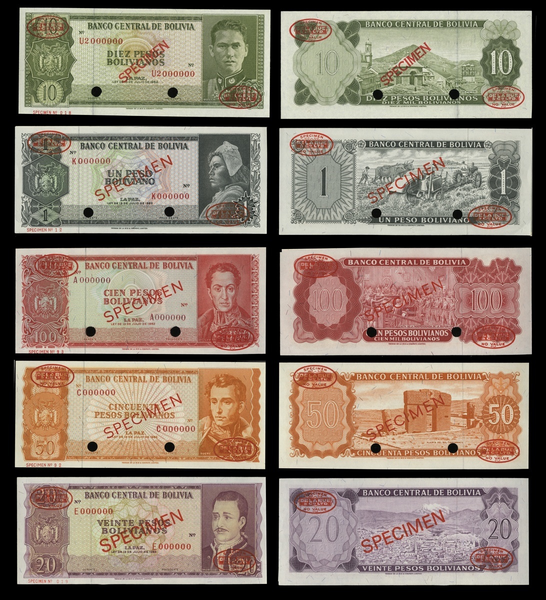 Bolivia. Banco Central de Bolivia. 1962 Issue Specimen Notes - 10 Pesos Bolivianos. First issue. P-154s3; and 1, 20, 50, and 100 Pesos Bolivianos. Second Issue. P-158s, 161s-163s. Portraits at right. Diagonal red SPECIMEN at center, TDLR stamps top left bottom right, punch cancelled at bottom. Choice AU-Uncirculated. [5]