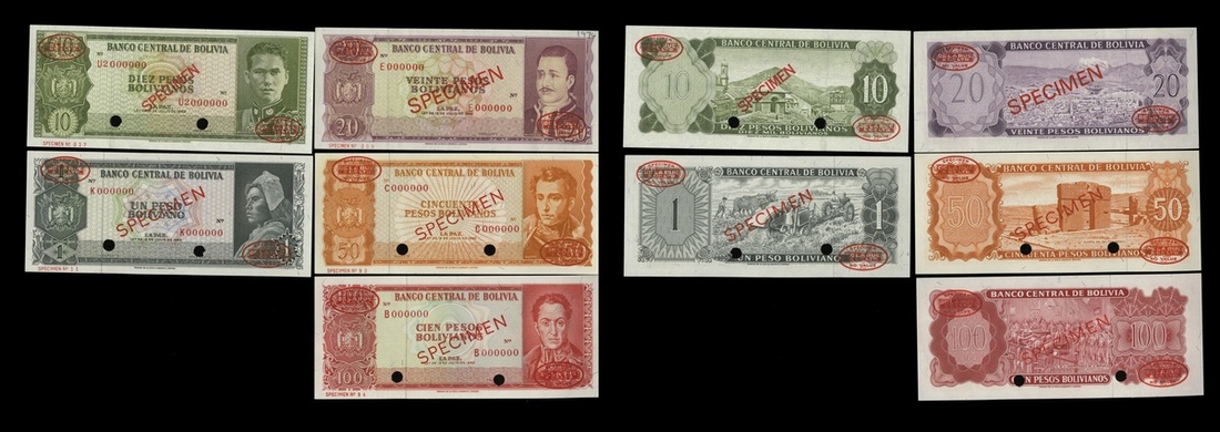 Bolivia. Banco Central de Bolivia. 1962 Issue Specimen Notes - 10 Pesos Bolivianos. First issue. P-154s3; and 1, 20, 50, and 100 Pesos Bolivianos. Second Issue. P-158s, 161s-163s. Portraits at right. Diagonal red SPECIMEN at center, TDLR stamps top left bottom right, punch cancelled at bottom. Choice AU-Uncirculated. [5]
