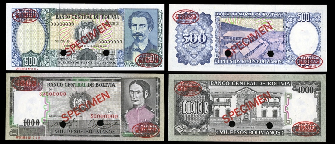 Bolivia. Banco Central de Bolivia. 500 and 100 Pesos Bolivianos. Law of 1981. P-166s, 167s. Portraits of Eduardo Avaroa, Juana Azurday de Padilla at right. Diagonal red SPECIMEN at center, TDLR stamps top left bottom right, punch cancelled at bottom. Choice AU. [2]