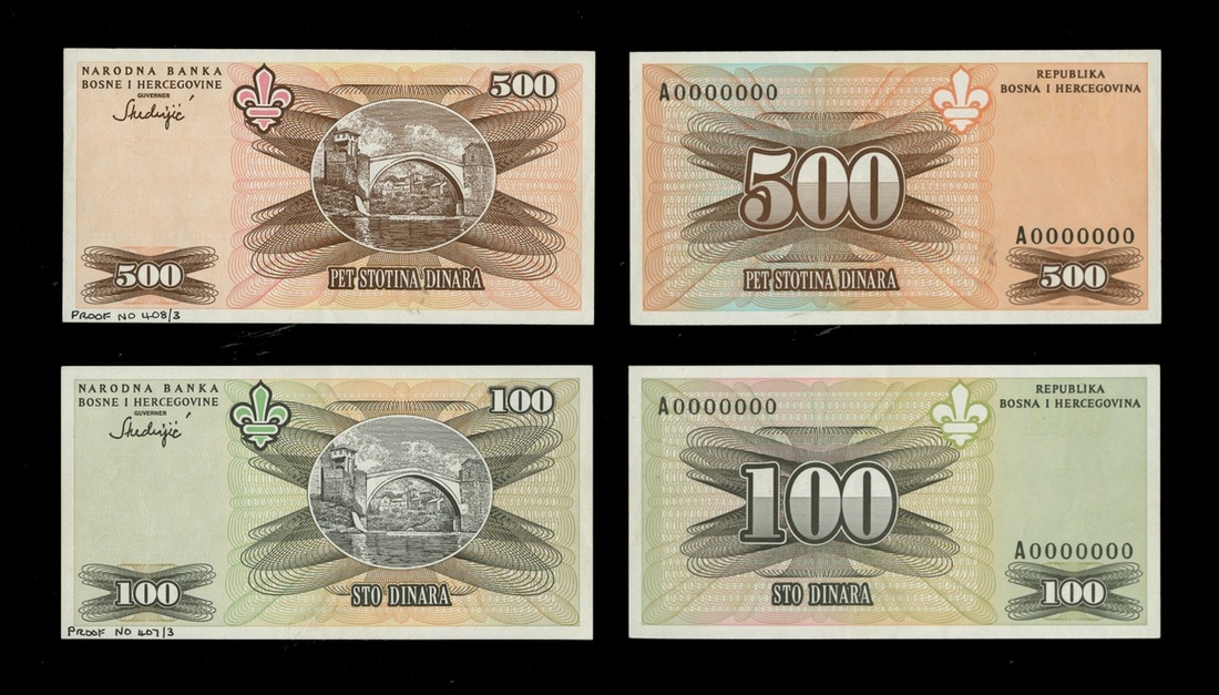 Bosnia-Herzegovina. Narodna Banka Bosnie I Hercegovine. Proof 100 and 500 Dinara. ND, ca. 1992. Pick--. Unadopted types. Numeral denomination at left, large fleur outline upper center, two-line legend upper right REPUBLIKA / BOSNA I HERCEGOVINA, Mostar stone bridge back right, large outline fleur, two-line bank legend at upper left, governor signature below. Inked bottom left margin "PROOF NO 407/3" and "PROOF NO 408/3". About Uncirculated. [2]