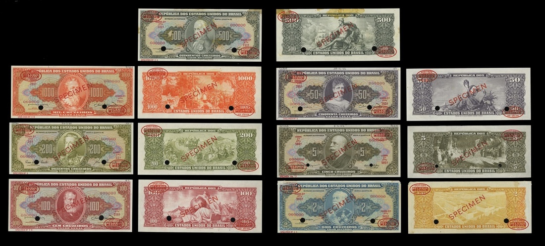 Brazil. Tesouro Nacional. 1953-60 Estampa 2A Issues Specimen Notes. 2, 5, 50, 100, 200, 500 and 1000 Cruzeiros. P-157s. Tape remnant. P-158s. Date annotation upper margin "8-4-52". P-161s. Date annotation upper margin. "28-12-62". P-162s; P-163s. Date annotation upper margin. "24-5-60". P-164s. Tape, glue residue on back. P-165s. Portraits at center. Diagonal red SPECIMEN at center, TDLR stamps top left bottom right, punch cancelled at bottom AU-Uncirculated. [7]