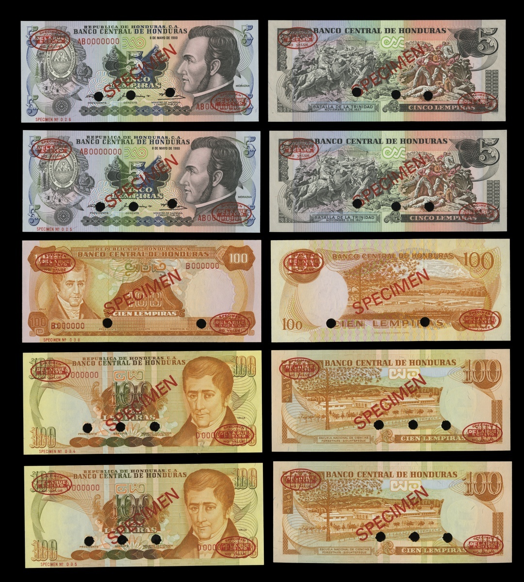Honduras. Banco Central de Honduras. Specimen Group: 5 Lempira. 1980 (2). P-63s. Morazon portrait at right; 100 Lempira. ND (1975); and ND (1981). P-67s, 69s. Valle portrait at left, Valle portrait at right. Diagonal red SPECIMEN at center, TDLR stamps top left and bottom right, punch cancels at bottom. Uncirculated. [5]