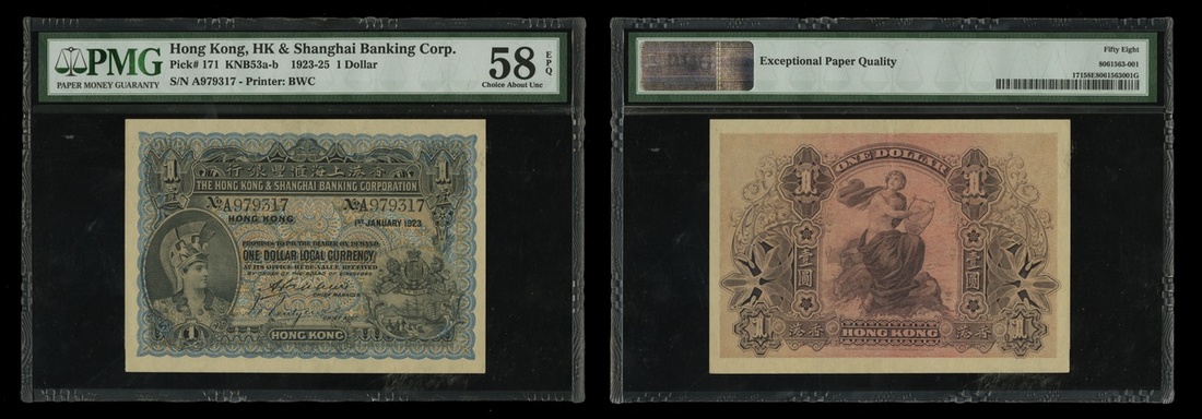Hong Kong. Hong Kong & Shanghai Banking Corporation. 1 Dollar. 1923. P-171. No. A979317. Black on blue, rose and yellow. Helmeted classical woman at lower left, Arms over port scene at lower right; Muse playing lyre at center of maroon and brown back. PMG Choice About Unc. 58 EPQ. Rare in such high-grade.