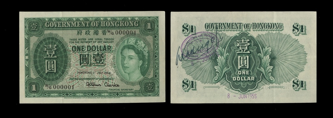 Hong Kong. Government of Hong Kong. One Dollar. 1954. P-324A. Low serial number. W/6 000001. Queen Elizabeth II portrait at right. Signed HSBC ink stamp on back with stamped date "8 - Jun 1955". Extremely Fine.