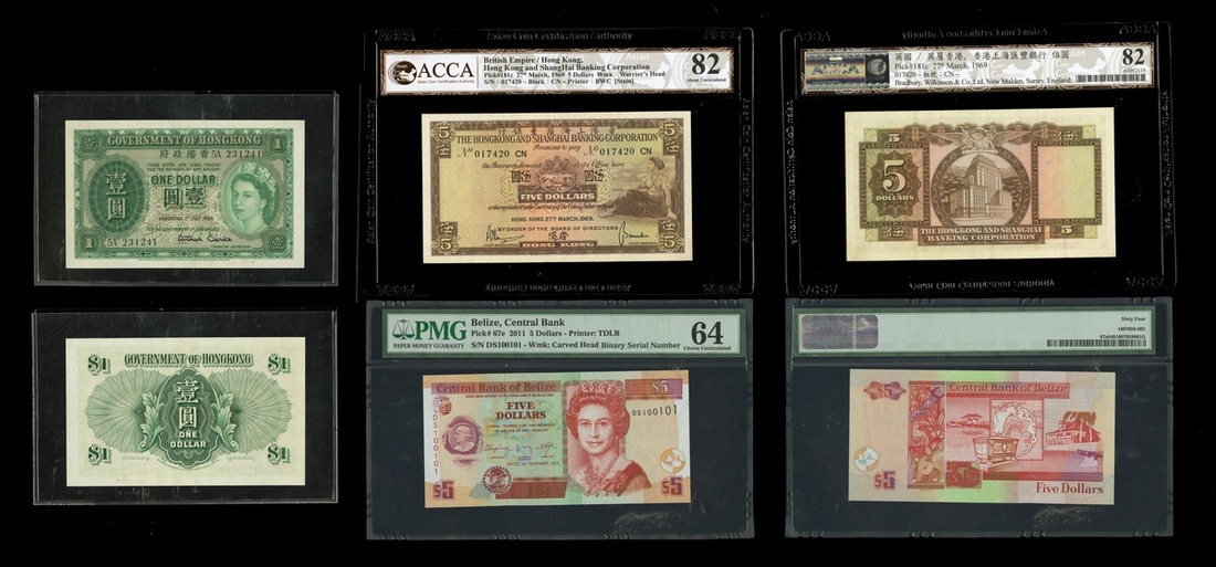 Hong Kong. Pair. Government of Hong Kong. 1 Dollar. 1958. P-324A. Hong Kong & Shanghai Banking Corporation. 5 Dollars. 1969. P-181c. ACCA About Unc 82; also Belize. Central Bank. 5 Dollars 2011. P-67e. PMG Choice Uncirculated 64. [3]