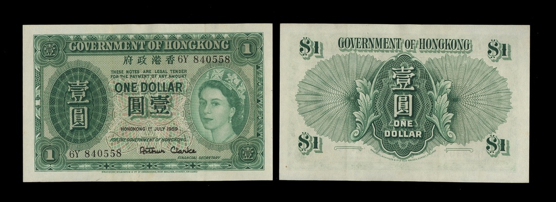 Hong Kong. Government of Hong Kong. Small run of One Dollar notes. 1st July 1959. P-324Ab. Nos. 6Y 840558 to 840566, and 946041. A few with very minor edge stain. Crispy. Extremely Fine. [10]