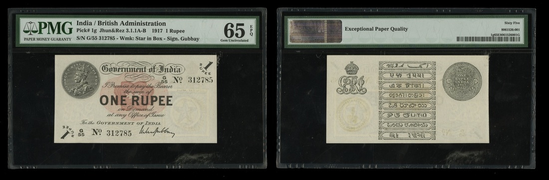 India. British Administration. Government of India. One Rupee 1917. P-1g. No. G/55 312785. Signed Gubbay. Obverse and reverse of George V Rupee front and back. PMG Gem Uncirculated 65 EPQ. Ex Sidney W. Harl and Kenneth W. Harl Collection.