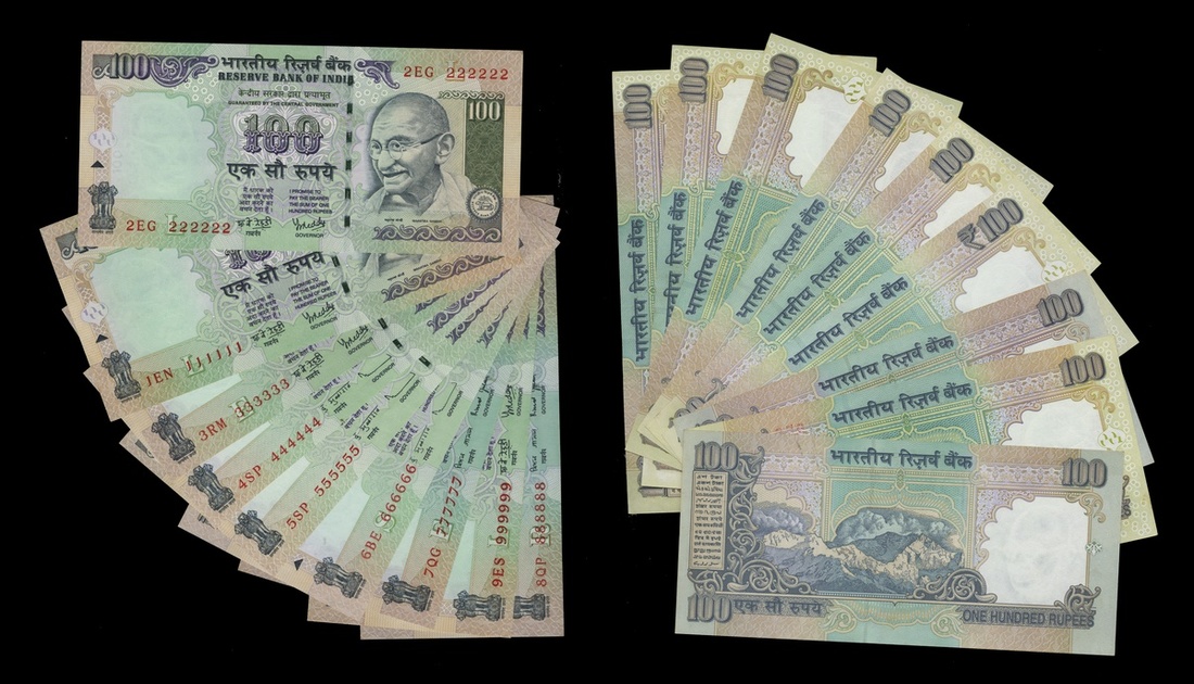 India. Reserve Bank of India. 100 Rupees. P-91, 98, 105. Solid six-digit serial numbers (111111-999999), different prefix number. Gandhi portrait at right; Himalayas at back left center. AU-Unc. [9]