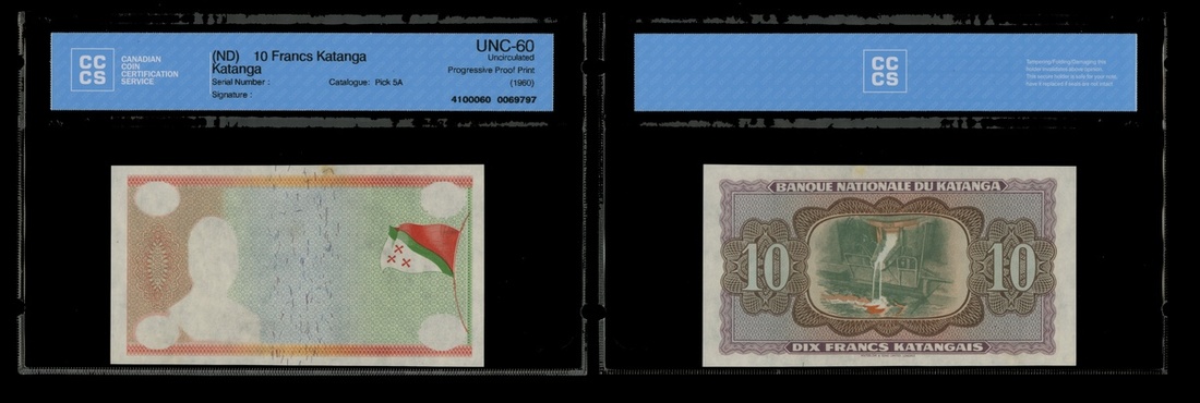 Katanga. Banque Nationale. 10 Francs. (1960). P-5A. Printer's essay. Lettering, Tshombe portrait, reservoir missing from front. PMG normally notes this rare essay as a "Missing Design Error", CCCS more accurately labels it a "Progressive Proof Print". CCCS Unc 60.