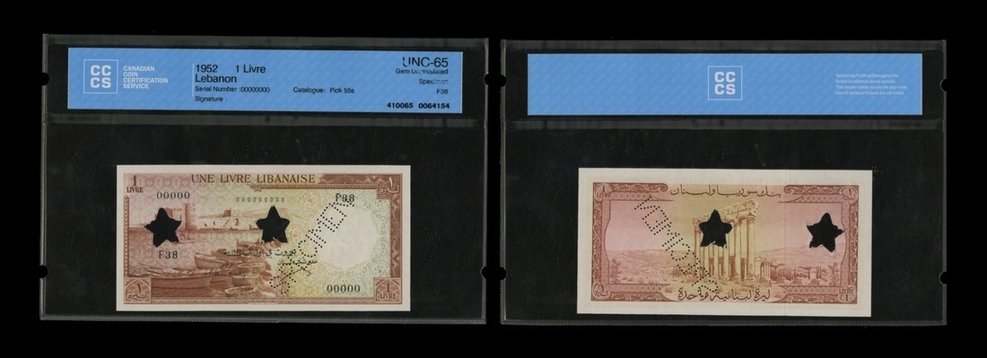 Lebanon. Banque de Syrie et du Liban. 1 Livre. 1952. Specimen. P-55s. Crusader castle at Sidon, boats; Columns of Baalbek on back. Perforated diagonal SPECIMEN. Two star punch cancels. CCCS Gem Unc 65.