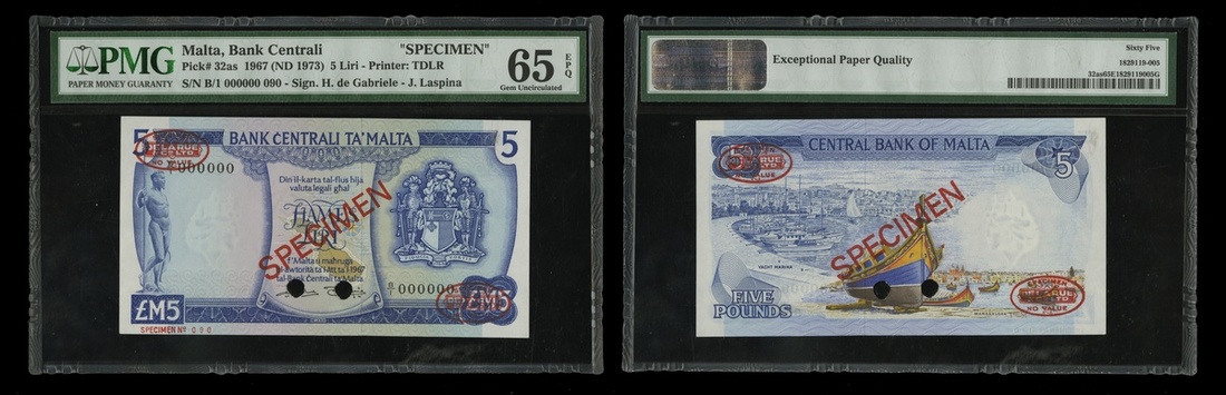 Malta. Bank Centrali ta'Malta. 5 Liri. Law 1967 (1973). P-32as. Specimen. No. B/I 000000 090. Blue on multicolor. Arms at right, map center, Neptune at left; marina and boats on back. Diagonal SPECIMEN, TDLR stamps top left, bottom right, two single punch cancels center bottom. PMG 65 Gem Uncirculated EPQ.