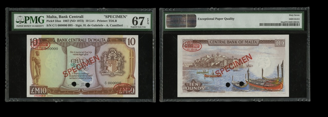 Malta. Bank Centrali ta'Malta. 10 Liri. Law 1967 (1973). P-33as. Specimen. No. C/I 000000 095. Brown on multicolor. Arms at right, map center, Neptune at left; View of Grand Harbour and boats on back. Diagonal SPECIMEN, TDLR stamps top left, bottom right, two single punch cancels center bottom. PMG 67 Superb Gem Unc EPQ.