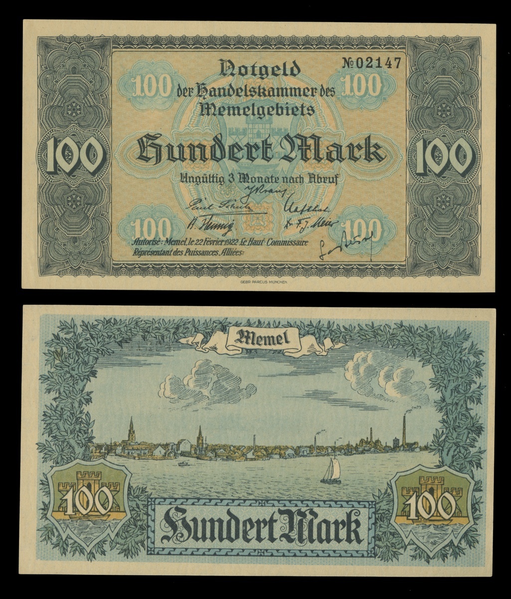 Memel. French Administration - Post WWI. Handelskammer des Memelgebiets. 100 Mark. 1922. P-9. Blue and light brown. View of Memel from the sea on back. Uncirculated.