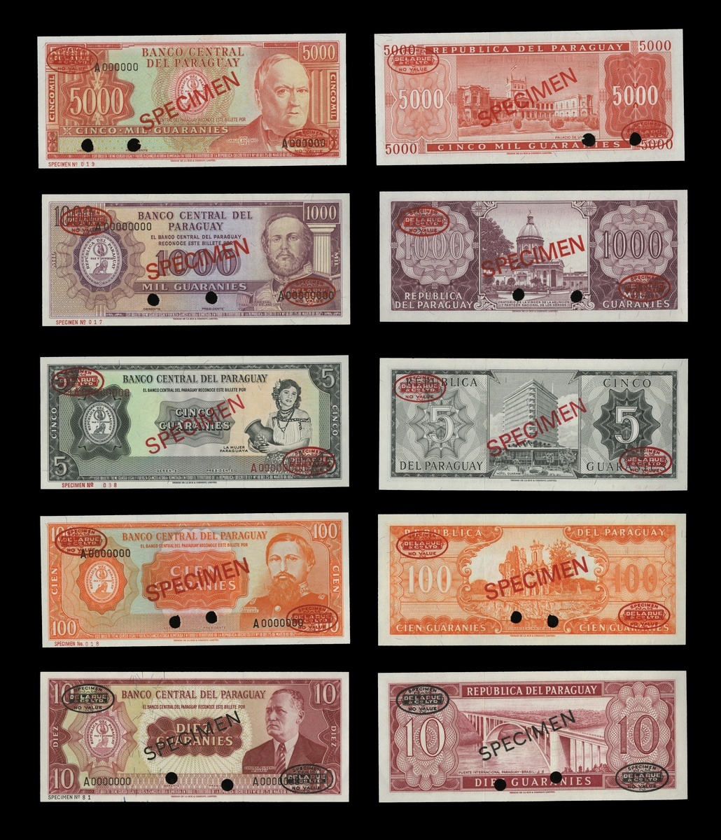 Paraguay. Banco Central. Law of 1952 (ca. 1963) Issues Specimen Notes - 5, 10, 100 (orange), 1000 and 5000 Guaranies. P-195s, 196s, 199s, 201s, 202s2. Woman holding jug at right; portraits at right. Diagonal red SPECIMEN at center (black on the 10 Guaranies), TDLR stamps top left and bottom right, two punch cancels at bottom (the first note no cancels). Uncirculated. [5]